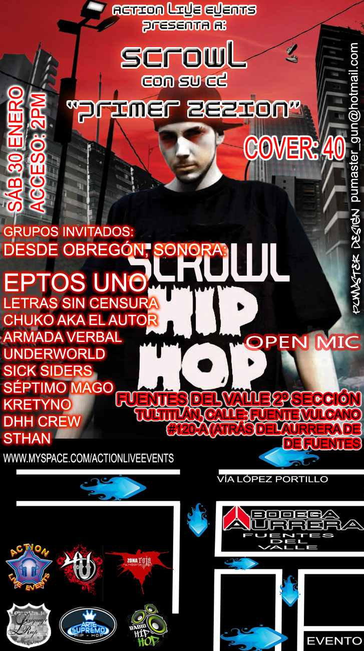 Action Live Events – 2010 January 30, 2010 1 min read by Doble-H Archivo de Eventos Fecha: 30 Enero 2010Costo: $40Hora: 2:00 pmLugar: Fuentes del valle 2da Sección Tultitlán, Calle Fuente Vulcano num. 120 (atras del Aurrera de Las Fuentes) Más info: www.myspace.com/actionliveevents Previous Viernes de Rap presenta – 2010 Next Descarga: RJD2 | The Colossus