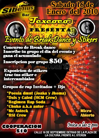 Evento de break dance y stikers – 2010 January 16, 2010 1 min read by MazPlata Archivo de Eventos Fecha: 16 Enero 2010 Hora: 2:00 PM Costo: $10 Lugar: Bar texcoco Dirección: Calle 16 de septiembre Previous Puro Hip Hop Mexicano Next Publicidad: Eptos Uno | Disciplina Nonstop