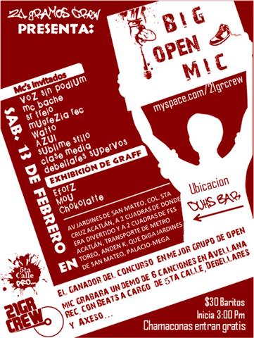 Big open mic – 2010 February 13, 2010 1 min read by MazPlata Archivo de Eventos Fecha: 13 febrero 2010 Hora: 3:00 pm Costo: $30 Lugar: Duhs Bar Dirección: Av. Jardines de San Mateo, Col. Sta. Cruz Acatlán, Naucalpan, Edo. de México Previous HipHop en el sa.sha club – 2010 Next Prohibido perrear aquí – 2010