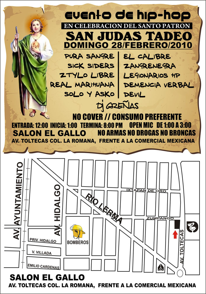 Evento de Hip Hop – San Judas Tadeo – 2010 February 28, 2010 1 min read by MazPlata Archivo de Eventos Fecha: 28 febrero 2010 Hora: 12:00 pm Costo: Gratis Lugar: salón el gallo Dirección: Av. Toltecas, Col. La Roma Previous Harcore Hip Hop Underground Toluca – 2010 Next El Pastel – 3ra Session – 2010