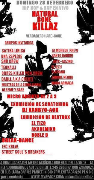Hip Hop & Rap en vivo – 2010 February 28, 2010 1 min read by MazPlata Archivo de Eventos Fecha: 28 febrero 2010 Hora: 2:00 pm Costo: $20 Lugar: U2 Planet Dirección: Oriente 245 y Clz. I. Zaragoza, Col. Agricola Orienal Previous El Pastel sesión 3.0 – 2010 Next Guru, en estado de coma después de un ataque cardíaco