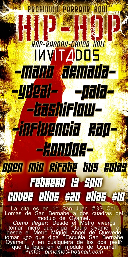 Prohibido perrear aquí – 2010 February 13, 2010 1 min read by MazPlata Archivo de Eventos Fecha: 13 febrero 2010 Hora: 5:oo pm Costo: Ellos $20, ellas $10 Lugar: ??? Dirección: Rio San Juan no. 30, col. Lomas de San Bernabe Previous Big open mic – 2010 Next Pelicula: Banksy | Exit Through the Gift Shop