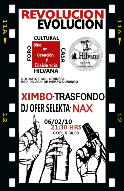 Revolución evolución – 2010 February 6, 2010 1 min read by MazPlata Archivo de Eventos Fecha: 6 febreor 2010 Hora: 9:30 pm Costo: $60 Lugar: Casa Hilvana Dirección: Colima no 378, Col. Condesa, D.F. Previous Más Rap en la calle – 2010 Next Ximbo en casa Hilvana – 2010