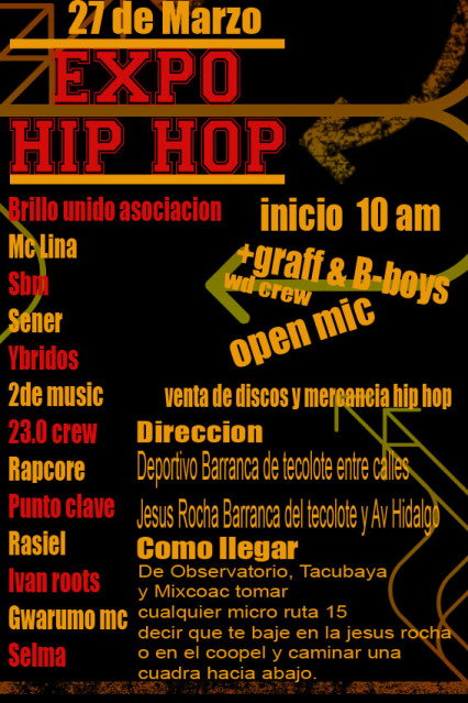 Expo Hip Hop | Marzo – 2010 March 27, 2010 1 min read by MazPlata Archivo de Eventos Fecha: 27 marzo 2010 Hora: 10:00 am Costo: ??? Lugar: Dptvo. Barranca del Tecolote Dirección: Jesús Rocha, Barranca del Tecolote y Av. Hidalgo Previous Battle of the beach 2010 Next Voces subterráneas 1er festival de Hip Hop – 2010