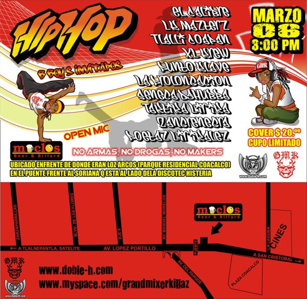Hip Hop en Miclos – 2010 March 6, 2010 1 min read by MazPlata Archivo de Eventos Fecha: 6 marzo 2010 Hora: 3:00 pm Costo: $20 Lugar: Miclos Dirección: Previous El Dober presenta (6 de marzo) – 2010 Next Pensamientos en voz alta | Hip Hop Under – 2010