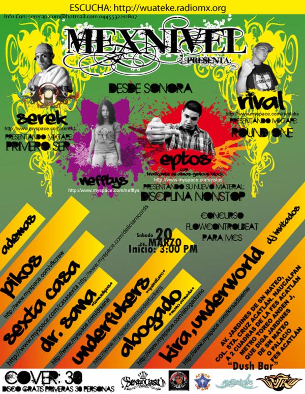 Mexnivel Presenta: – 2010 March 20, 2010 1 min read by MazPlata Archivo de Eventos Fecha: 20 marzo 2010 Hora: 3:00 pm Costo: $30 Lugar: Dush bar Dirección: Av. Jardines de San Mateo, Col. Sta. Cruz Acatlán Previous Descarga: WC | Guilty by affilation Next Hip Hop en Basik Bar – 2010