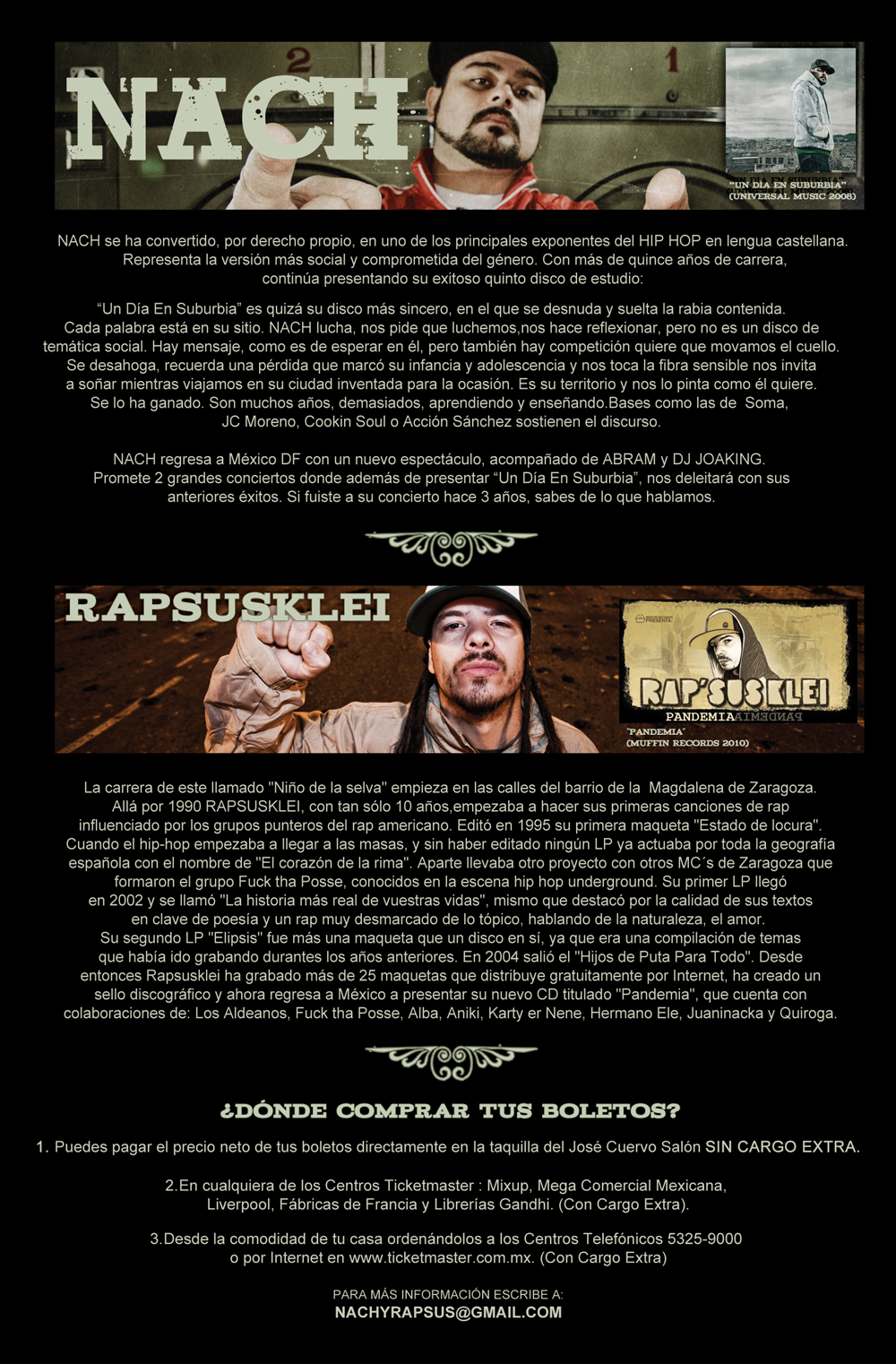 Nach y Rapsusklei estaran de regreso en México, el próximo 8 y 9 de mayo, 6:00 p.m. Salón Cuervo (antes salón 21) Lago Andrómaco No 17, Col. Ampliación granada, Deleg. Miguel Hidalgo (a unas calles del metro San Joaquin). Entrada general todas las edades $250 VIP $350 mayores de edad con IFE. Venta de boletos en taquillas del José Cuervo Salón (sin cargo extra) o en el sistema Ticket Master (con cargo adicional). No armas, No drogas, No videocàmaras, No markers.