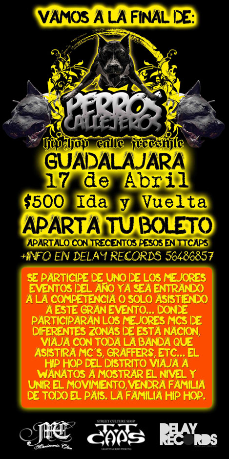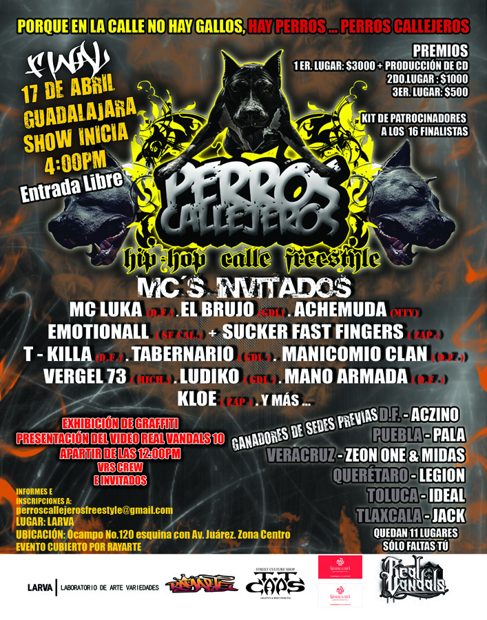 “Porque en la calle no hay gallos, hay perros… perros callejeros”. Bajo éste epígrafe se abrió un nuevo capítulo en las batallas de freestyle de nuestro país, dando pie al proyecto “Perros Callejeros”, donde se reunirán 16 freestylers del centro del país para competir.