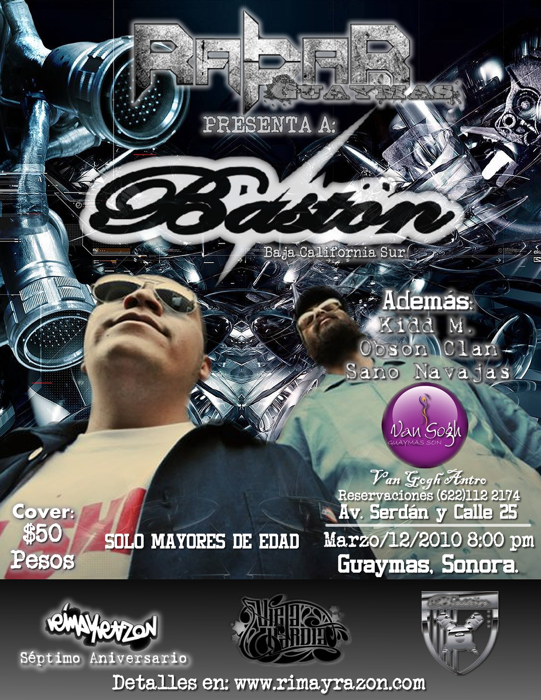 RapBar Guaymas presenta: – 2010 March 12, 2010 1 min read by MazPlata Archivo de Eventos Fecha: 12 marzo 2010 Hora: 8:00 pm Costo: $ 50 Lugar: Van Gogh Dirección: Av. Serdan y calle 25 Previous Evento: Perros Callejeros | Gran Final – 2010 Next Hip Hop nacional en el Vulbar – 2010