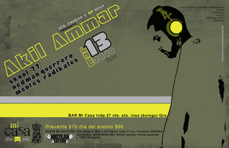 Sta. Rocksa y WR Crew presentan: – 2010 March 13, 2010 1 min read by MazPlata Archivo de Eventos Fecha: 13 marzo 2010 Hora: 7:00 pm Costo: Preventa $ 70, día de evento $ 90 Lugar: Bar mi casa Dirección: Independencia norte, num 27. Previous Expo Grafiti y Hip Hop | Puebla – 2010 Next Música por nuestra gente | Chalco – 2010