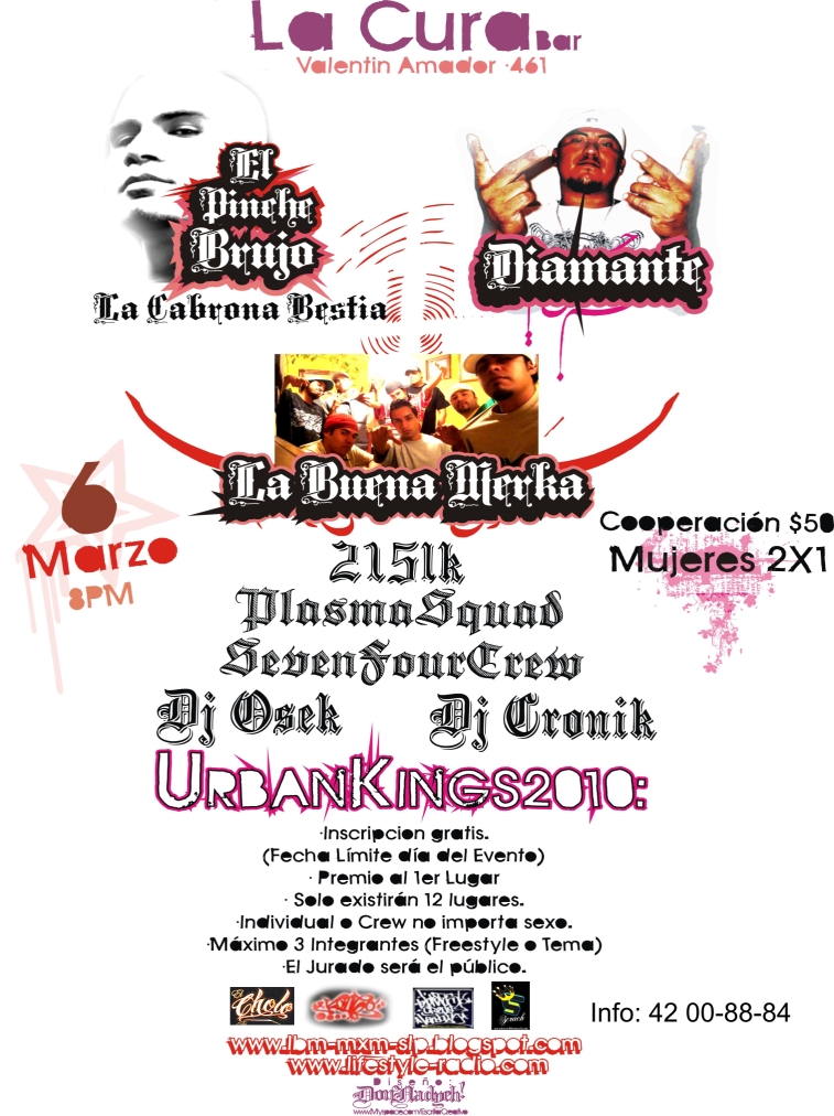 Urbankings – 2010 March 6, 2010 1 min read by MazPlata Archivo de Eventos Fecha: 6 marzo 2010 Hora: 8:00 pm Costo: $ 50 Lugar: la Cura bar Dirección: Valentin amador num. 461, Col .san francisco Previous Descarga: Reverse Engineering | Duck & Cover Next El Dober presenta (6 de marzo) – 2010