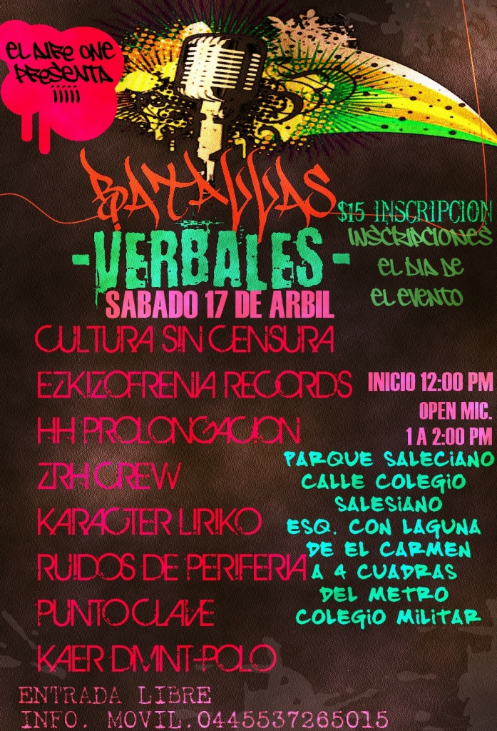 Batallas verbales | Abril 2010 April 17, 2010 1 min read by MazPlata Archivo de Eventos Fecha: 17 abril 2010 Hora: 12:00 pm Costo: evento gratuito Lugar: Parque Saleciano Dirección: Calle Colegio Salesiano Previous Perros Callejeros | Hip Hop Calle Freestyle – 2010 Next Hip Hop: Calor de calle – 2010