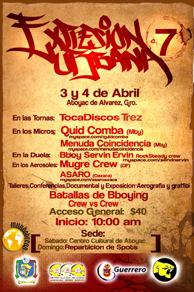 Expresión Urbana 7 – 2010 April 4, 2010 1 min read by MazPlata Archivo de Eventos Fecha: 3 y 4 de abril, 2010 Hora: 10:00 am Costo: $ 40 Lugar: Centro cultural de Atoyac Dirección: ??? Previous Evento: The versatil War 2 | Batallas mc’s 2 a 2 – 2010 Next Fat Joe | Firma contrato con E1 Music y confirma nuevo álbum