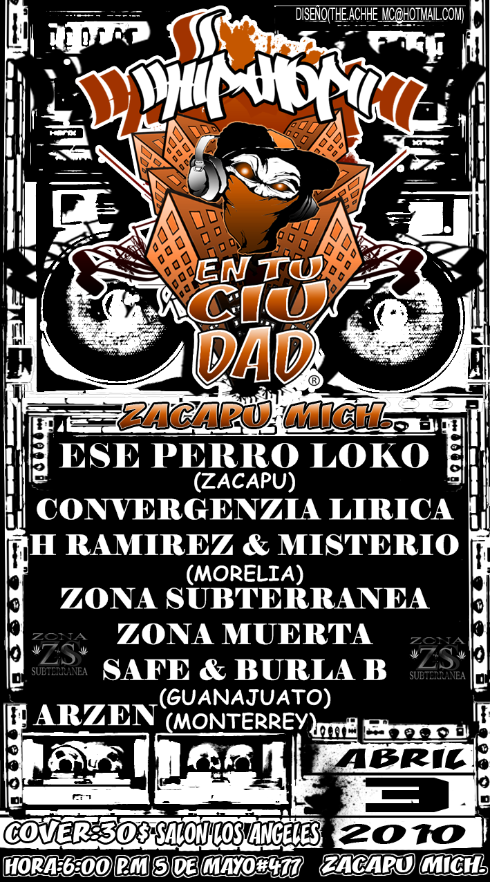 Hip Hop en tu ciudad | Zacapu, Mich. – 2010 April 3, 2010 1 min read by MazPlata Archivo de Eventos Fecha: 3 abril 2010 Hora: 6:00 pm Costo: $ 30 Lugar: Salón los Ángels Dirección: 5 de mayo no. 477 Previous Rap subterraneo mexicano – 2010 Next Plaza Peyote | 3 abril – 2010