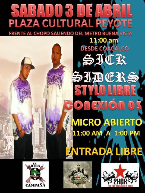 Plaza Peyote | 3 abril – 2010 April 3, 2010 1 min read by MazPlata Archivo de Eventos Fecha: 3 abril 2010 Hora: 11:00 am Costo: Entrada libre Lugar: Plaza Peyote Dirección: Previous Hip Hop en tu ciudad | Zacapu, Mich. – 2010 Next Evento: The versatil War 2 | Batallas mc’s 2 a 2 – 2010