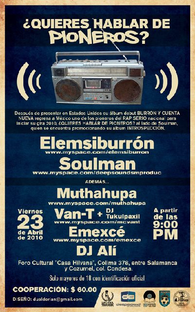 ¿Quieres hablar de pioneros? – 2010 April 23, 2010 1 min read by MazPlata Archivo de Eventos Fecha: 23 abril 2010 Hora: 9:00 pm Costo: $60 Lugar: Foro cultural Caa Hilvana Previous Descarga: Joob | Nebula EP Next Descarga: Supakanja | Supanova1044