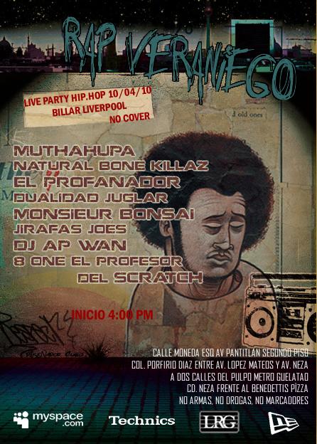 Rap veraniego – 2010 April 10, 2010 1 min read by MazPlata Archivo de Eventos Fecha: 10 abril 2010 Hora: 4:00 pm Costo: Entada libre Lugar: Billar Liverpool Dirección: Calle moneda, Col. Porfirio Díaz Previous Single: Pato Machete | Alma Next DevonWho | Thumbtracks Remixes Vol. 1