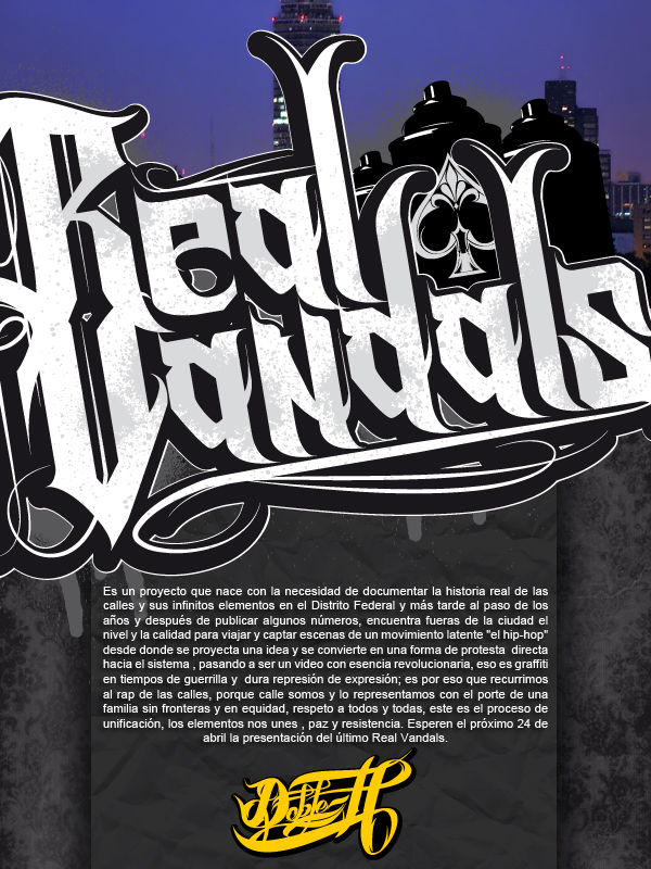 Es un proyecto que nace con la necesidad de documentar la historia real de las calles y sus infinitos elementos en el Distrito Federal y más tarde al paso de los años y después de publicar algunos números, encuentra fueras de la ciudad el nivel y la calidad para viajar y captar escenas de un movimiento latente “el hip-hop” desde donde se proyecta una idea y se convierte en una forma de protesta directa hacia el sistema , pasando a ser un video con esencia revolucionaria, eso es graffiti en tiempos de guerrilla y dura represión de expresión; es por eso que recurrimos al rap de las calles, porque calle somos y lo representamos con el porte de una familia sin fronteras y en equidad, respeto a todos y todas, este es el proceso de unificación, los elementos nos unes , paz y resistencia. Esperen el próximo 24 de abril la presentación del último Real Vandals.