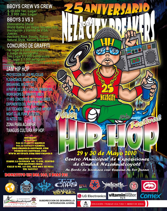 25 Aniversario Neza City Breakers – 2010 May 30, 2010 1 min read by MazPlata Archivo de Eventos Fecha: 29 y 30 mayo 2010 Hora: ??? Costo: $60 Lugar: Centro Municipal de Exposiciones de Ciudad Nezahualcóyotl Dirección: Av. Bordo de Xochiaca casi esq. Av. Sor Juana Previous Gallery 2-010 Next Hip Hop mexicano en el African Star – 2010