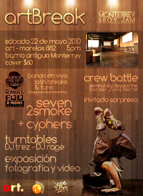 artBreak – 2010 May 22, 2010 1 min read by MazPlata Archivo de Eventos Fecha: 22 mayo 2010 Hora: 5:oo pm Costo: $60 Lugar: Art Dirección: Morelos 882, Barrio Antiguao Previous 1er aniversario por que somos calle – 2010 Next Buscando al Mejor – 2010