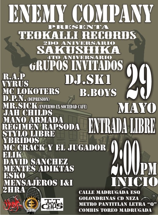 Enemy Company presenta: – 2010 May 29, 2010 1 min read by MazPlata Archivo de Eventos Fecha: 291 may0 2010 Hora: 2:00 pm Costo: Entrada libre Lugar: ??? Dirección: Calle Madrugada esq. Golondrinas, Cd Neza Previous Nedman Guerrero – 29 Mayo 2010 Next Muy Gallo? – 2010