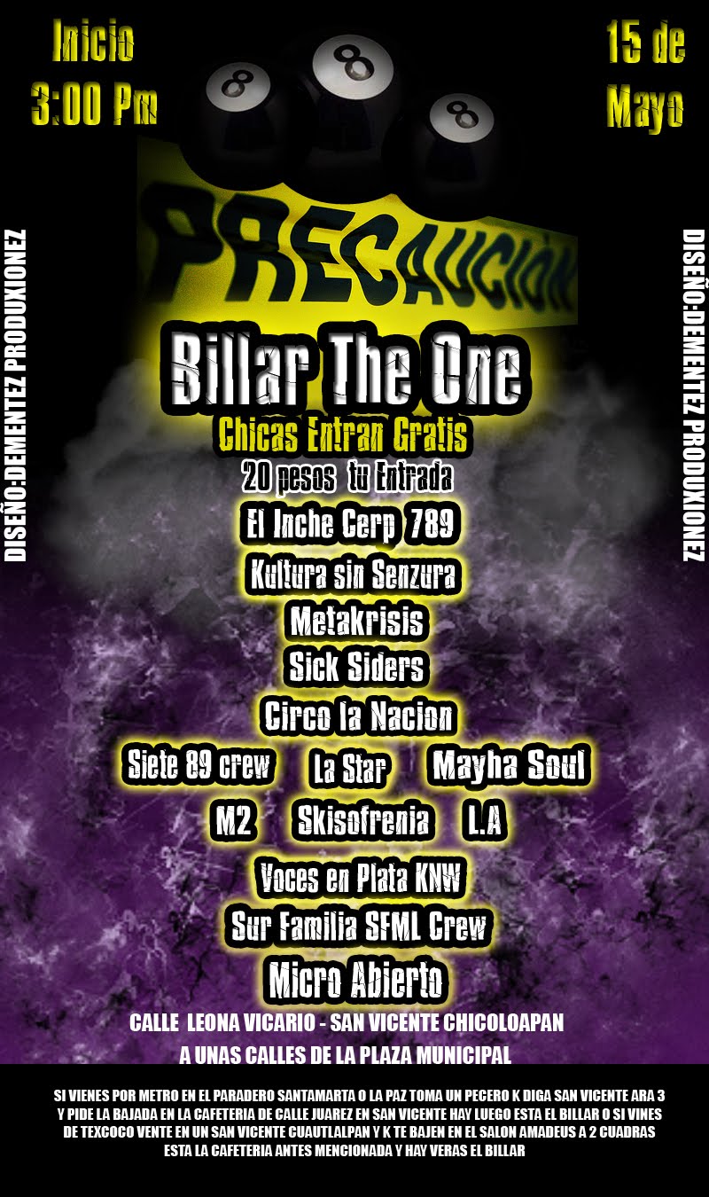 Precaución – 2010 May 15, 2010 1 min read by MazPlata Archivo de Eventos Fecha: 15 Mayo 2010 Hora: 3:00 pm Costo: $20 Lugar: Billar The One Dirección: Calle Leona Vicario, San Vicente Chicoloapan Previous Hip – Hop de calle – 2010 Next Video: Simplee & Ckae | No sé donde (Prod. Dicta)