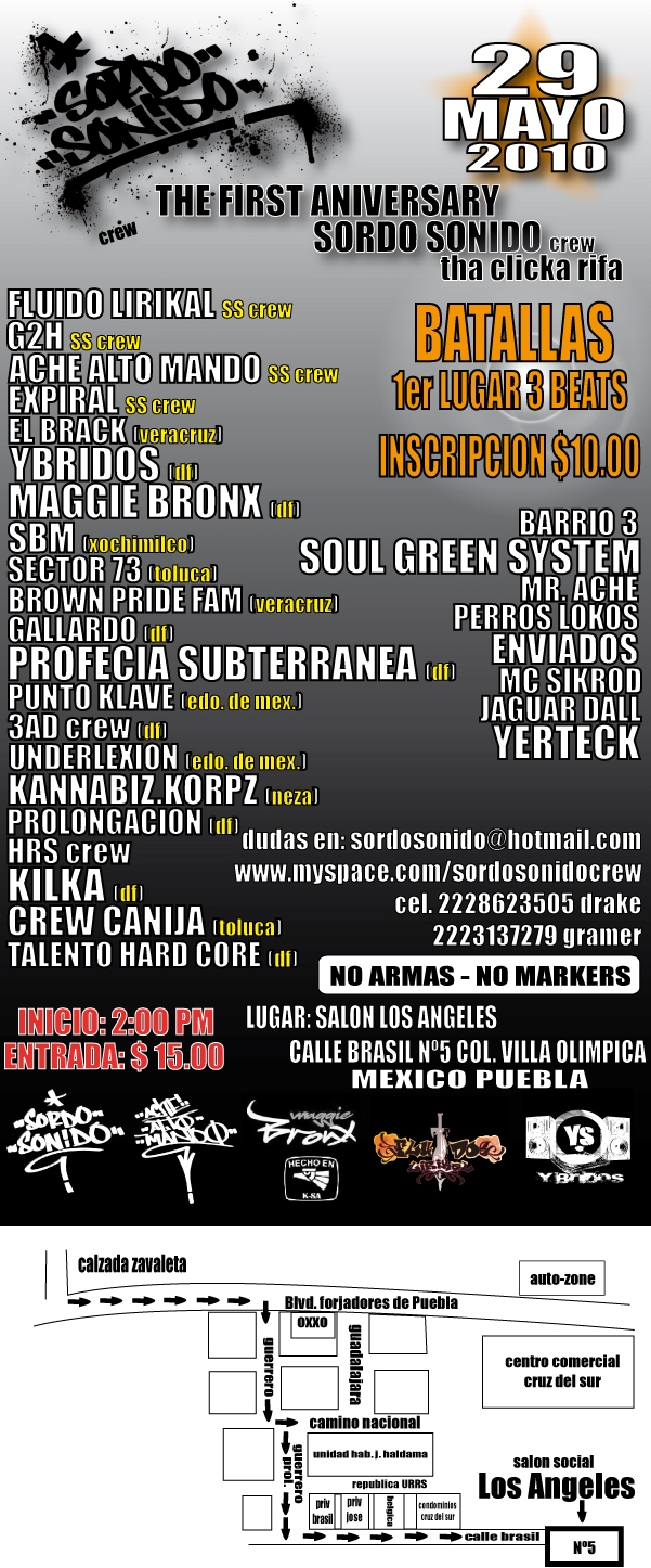 The first aniversary Sordo Sonido crew – 2010 May 29, 2010 1 min read by MazPlata Archivo de Eventos Fecha: 29 mayo 2010 Hora: 2:00 pm Costo: $15 Lugar: Salón los angeles Dirección: Calle Brasil no. 5, Col. Villa Olímpica Previous Muy Gallo? – 2010 Next Batallas de E H – 2010