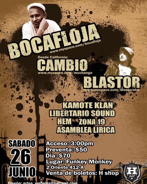 26 junio 2010 June 26, 2010 1 min read by MazPlata Archivo de Eventos Fecha: 26 junio 2010 Hora: 3:00 pm Costo: $70 Lugar: Funkey Monkey Dirección: 2 oriente no. 412-a Previous Videos: Monster Verbal Combat | Final 2010 Next Evento: Presentacion Mixtape Never Die Records | DF