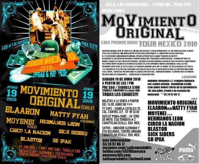 Así es, tenemos 5 boletos de regalo para que puedas ir a ver a Movimiento Original mañana Sábado 19 en el Sativa Club en compañia de El Aaron, Natty Fyah ( Colombia ), Moyenei ( Chile ), Hermanos León, Circo la Nación, Sick Siders, Blastor y Sr Ipak. Siendo que solo queda un dia la mecanica para ganartelos sera muy facil, solo tienes que enviar un mensaje via Twitter @hiphopmexico o dejar un comentario en nuestro Facebook, los primeros 5 ganan.