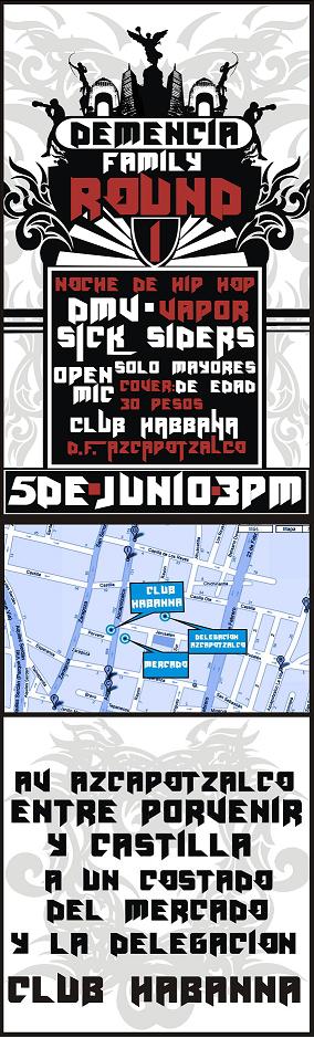 Demencia Family Round 1 June 5, 2010 1 min read by MazPlata Archivo de Eventos Fecha: 5 junio 2010 Hora: 3:00 pm Costo: $30 Lugar: Club Habanna Dirección: Av Azcapotzalco, entre Porvenir y castilla Previous Hip Hop in tha house Next African Star presenta: