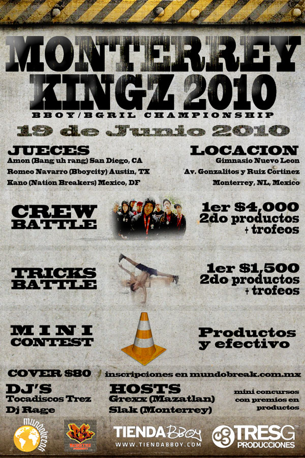 Monterrey Kingz 2010 June 19, 2010 1 min read by MazPlata Archivo de Eventos Fecha: 19 junio 2010 Hora: ??? Costo: $80 Lugar: Gimnasio Nuevo Léon Dirección: Av Gonzalitos y Ruiz cortinez Previous Rap mexicano en el disco La LLorona – 2010 Next Expo Graff Unidad Tepalcates – 2010