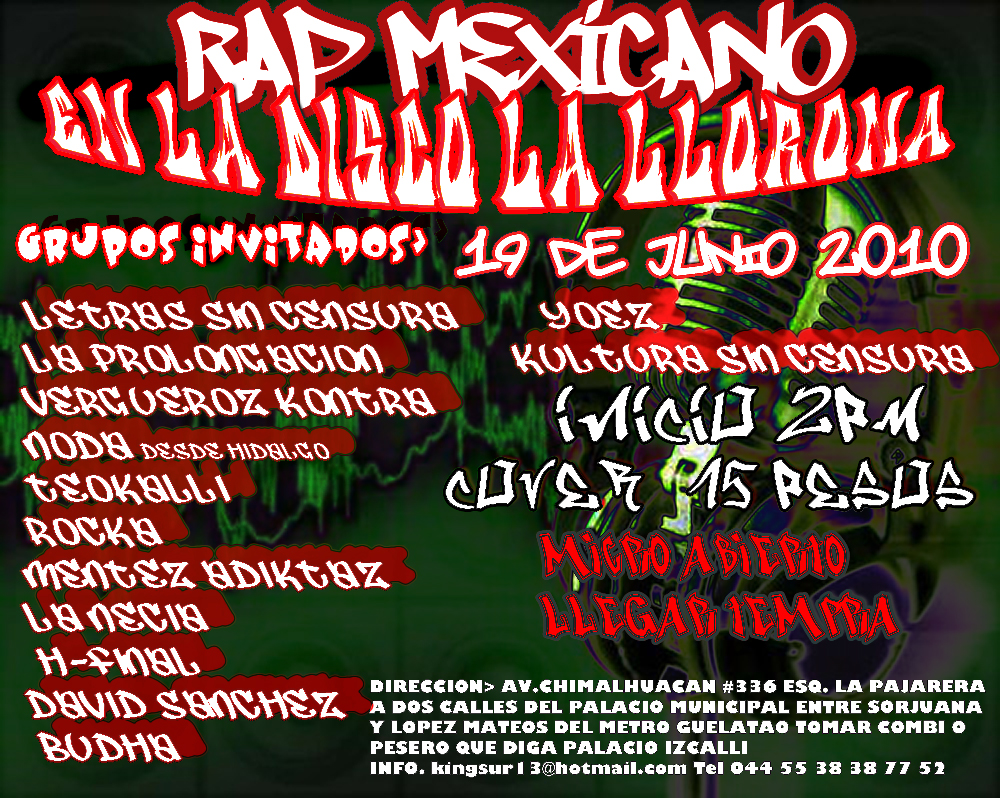 Rap mexicano en el disco La LLorona – 2010 June 19, 2010 1 min read by MazPlata Archivo de Eventos Fecha: 19 junio 2010 Hora: 2:00 pm Costo: $15 Lugar: la LLorona Dirección: Av. Chimnalhuacán no. 336, esq. La Pajarera Previous 1er Festival Internacional, Ritmos Hermanos – 2010 Next Monterrey Kingz 2010