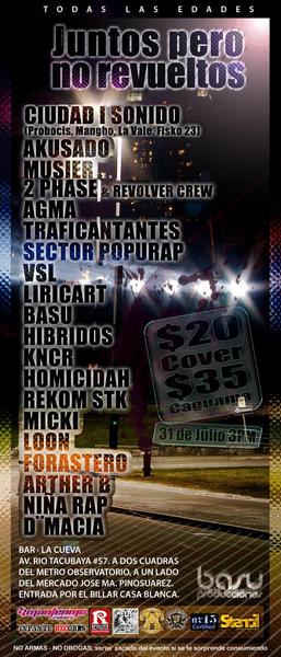 31 Julio | Juntos pero no revueltos – 2010 July 31, 2010 1 min read by Doble-H Archivo de Eventos Fecha: 31 Julio 2010 Hora: 3pm Costo: $20, Caguama $35 Lugar: Bar La Cueva Previous La casa del Rap – 2010 Next Jezzy P | Hip hop session – 2010