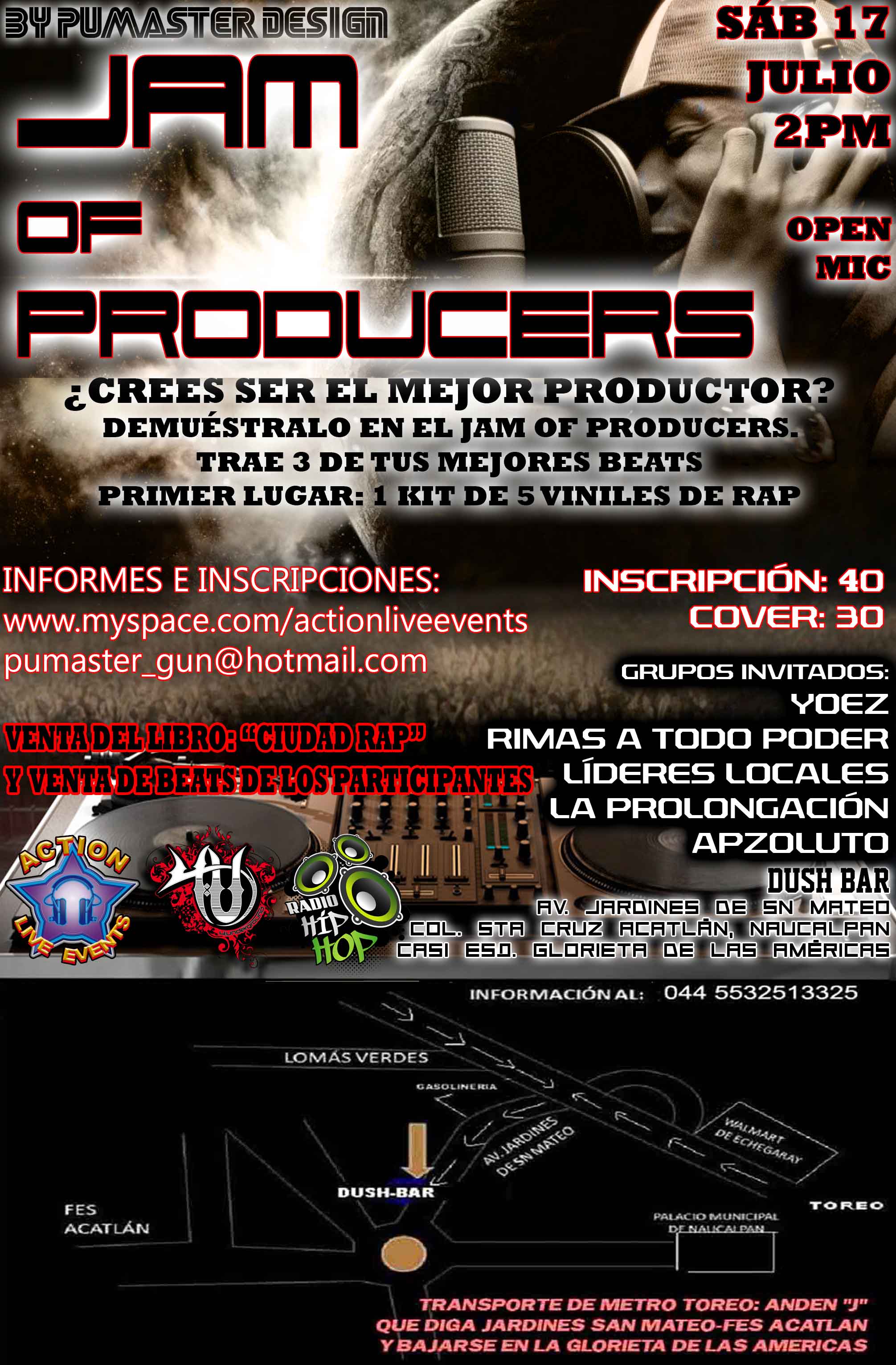 Jam of producers – 2010 July 17, 2010 1 min read by MazPlata Archivo de Eventos Fecha: 17 julio 2010 Hora: 2:00 pm Costo: $30 Lugar: Dush Bar Dirección: Av Jardines de San Mateo, col. Sta. Cruz Acatlan Previous Under calli 2010 Next Infante records presenta: 17 julio 2010