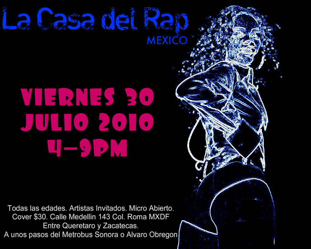 La casa del Rap – 2010 July 30, 2010 1 min read by MazPlata Archivo de Eventos Fecha: 30 julio 2010 Hora: 4:00 pm Costo: $30 Lugar: ??? Dirección: Calle Medellin no 143, Col. Roma Previous Batalla del sabor – 2010 Next 31 Julio | Juntos pero no revueltos – 2010