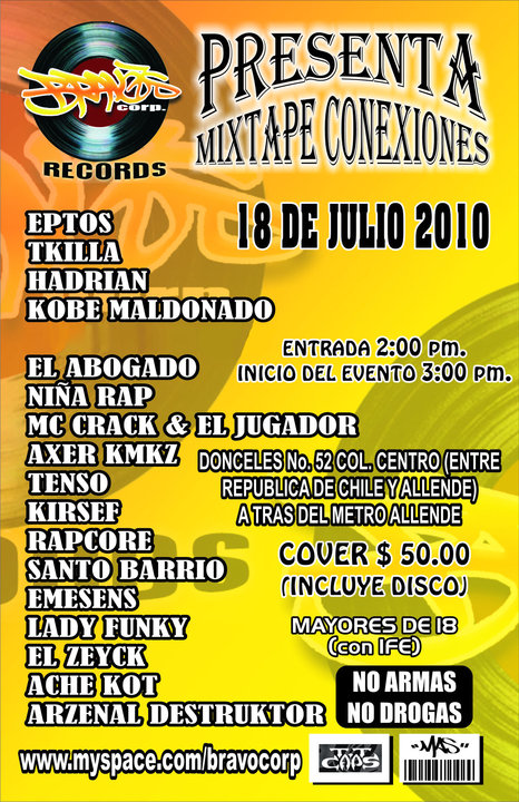 Mixtape Conexiones – 2010 July 18, 2010 1 min read by MazPlata Archivo de Eventos Fecha: 18 julio 2010 Hora: 2:00 pm Costo: $50 Lugar: ??? Dirección: Dondceles no. 52, Col. Centro Previous Audioparty 2010 Next Presentación del libro Ciudad Rap