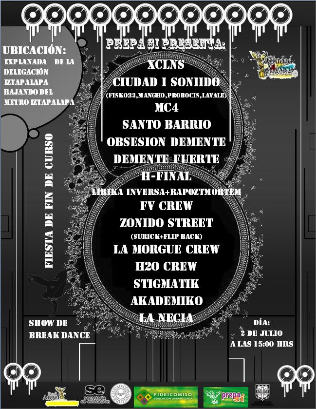 Prepa sí presenta: – 2010 July 2, 2010 1 min read by MazPlata Archivo de Eventos Fecha: 2 julio 2010 Hora: 3:00 pm Costo: Entrada libre Lugar: Explanada de la delegación Iztapalapa Dirección: Previous Concurso: Ganate un libro “Ciudad Rap” Next Escandalo al descaro – 2010