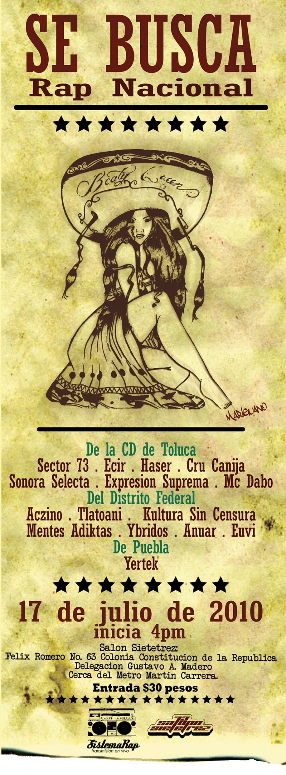 Se busca | Rap nacional – 2010 July 17, 2010 1 min read by MazPlata Archivo de Eventos Fecha: 17 julio 2010 Hora: 4:00 pm Costo: $30 Lugar: Saló sietetrez Dirección: Felix Romero no. 63, Col. Constitución Previous La espantosa llegada del RAP a México | La gran confusión Next Under calli 2010