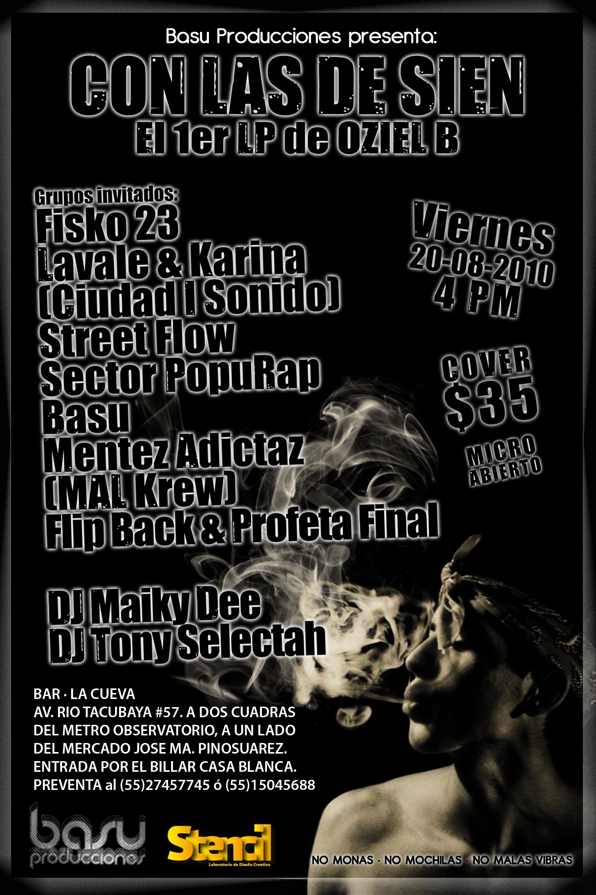 20 Agosto | Oziel B Presenta 1er LP – 2010 August 20, 2010 1 min read by Doble-H Archivo de Eventos Fecha: 20 agosto 2010 Hora: 4 pm Costo: $35 Lugar: Bar La Cueva Previous Arte Supremo mixtape | presentación septiembre – 2010 Next 21 agosto 2010 | Dimensional Dream