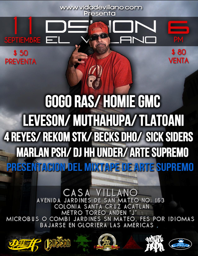 Arte Supremo mixtape | presentación septiembre – 2010 August 20, 2010 1 min read by MazPlata Archivo de Eventos Fecha: 11 septiembre 2010 Hora: 6:00 pm Costo: Preventa $50 Lugar: Casa Villano Dirección: Av. Jardines de San Mateo No.163, Col. Santa Creuz Acatlan Previous Fat Beats anuncia el cierre de dos de sus tiendas Next 20 Agosto | Oziel B Presenta 1er LP – 2010