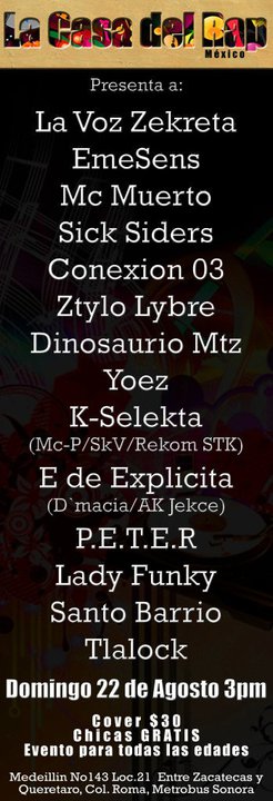 La casa del rap | 22 agosto 2010 August 22, 2010 1 min read by MazPlata Archivo de Eventos Fecha: 22 agosto 2010 Hora: ??? Costo: $30 Lugar: ??? Dirección: Medellin no, 143, local 21, col. Roma Previous 21 agosto | Atake verbologico Next Combativo 14 | Entrevista con Nedman Guerrero