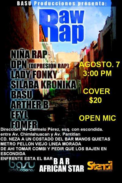 Raw rap – 2010 August 7, 2010 1 min read by MazPlata Archivo de Eventos Fecha: 7 agosto 2010 Hora: 3:00 pm Costo: $20 Lugar: African Star Dirección: Av Carmelo Pérez, esq. Escondida Previous Rap de maíz – 2010 Next Entrevista: Nedman Guerrero
