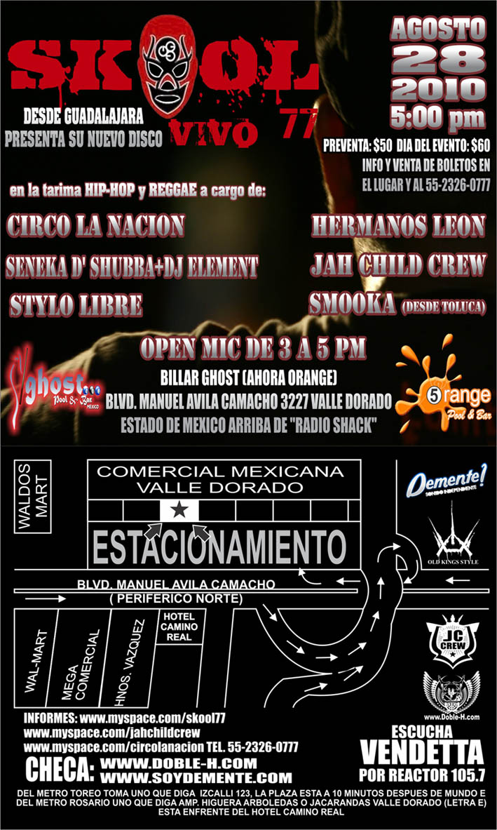 Tlalnepantla 28 agosto 2010 | Skool 77 August 28, 2010 1 min read by MazPlata Archivo de Eventos Fecha: 28 agosto 2010 Hora: 5:00 pm Costo: $50 preventa Lugar: Orange (antes Billar Ghost) Dirección: Blvd Manuel Avila Camacho. Previous Mexzkuad 1830 – 2010 Next Anuar | presenta: El tiempo no pasa en vano