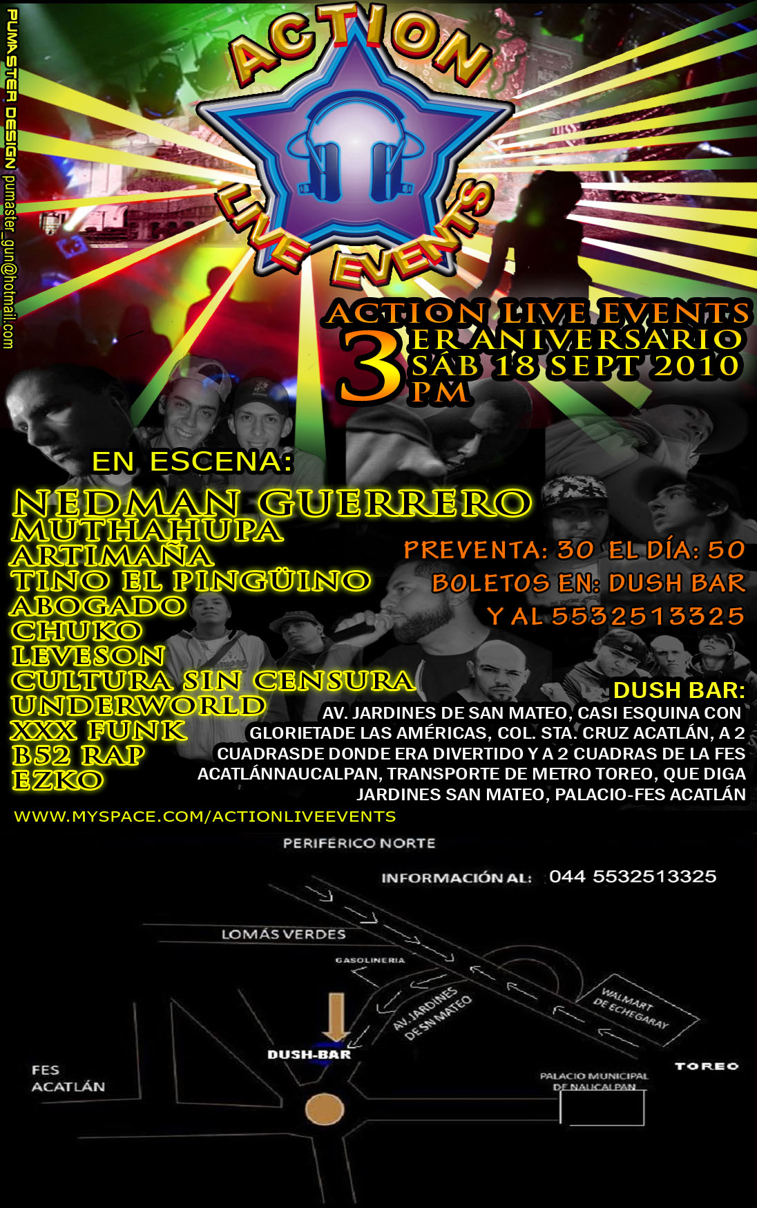Action Live Events | 3er Aniversario – 2010 September 18, 2010 1 min read by MazPlata Archivo de Eventos Fecha: 18 septiembre 2010 Hora: 3:00pm Costo: Preventa $30, Día del evento $50 Lugar: Dush Bar Dirección: Av Jardines de san Mateo, Col. Santa Cruz Acalán Previous 4to Aniversario WSK – 2010 Next ¡Viva MeHip-Hop! 2010