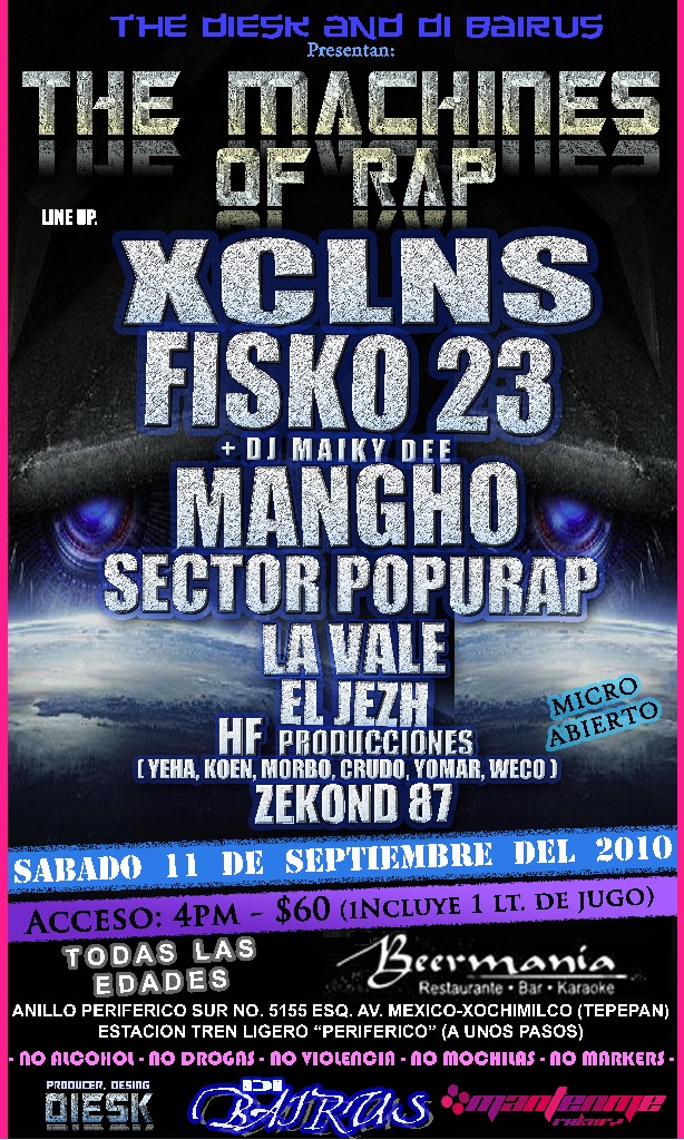 The machines of rap | 11 septiembre 2010 September 11, 2010 1 min read by MazPlata Archivo de Eventos Previous La orden del dragón | Dragon Rojo – 2010 Next Outrage en México | 11 Septiembre 2010