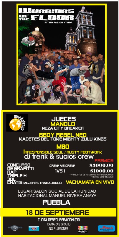 Warriors of the floor 2010 September 18, 2010 1 min read by MazPlata Archivo de Eventos 18 septiembre 2010 $30 Salón social Puebla Previous 1er festival mexicano de hip hop – 2010 Next Descarga: 3G Crew | La Tribu (prod. by Jarsman)