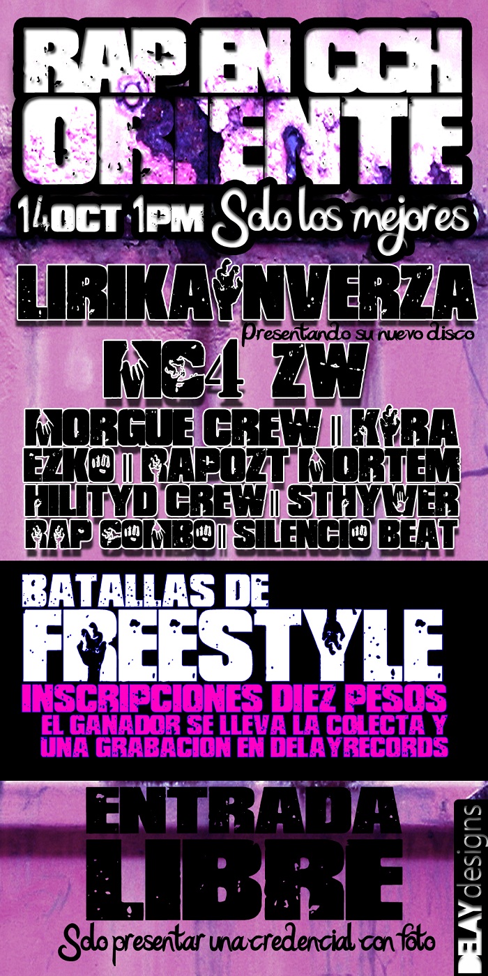 Pues algo tarde la propaganda aki esta un evento organizado por los mcs del CCH Oriente con motivo de la presentacion del disco de Lirica Inverza habra batallas de freestyle, ademas de las presentaciones de MC4, Zw, Morgue Crew, Kira, Rapozt Mortem y muchos mas caiganle la entrada es gratuita solo presentando cualquiero tipo de identificacion con foto.