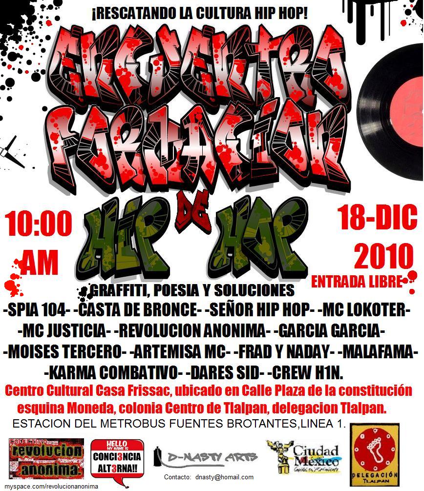 Encuentro formación de hip hop – 2010 December 18, 2010 1 min read by MazPlata Archivo de Eventos Previous Justiniani | Mi versión de los hechos – 18 diciembre 2010 Next Valle de Chalco | 19 diciembre 2010