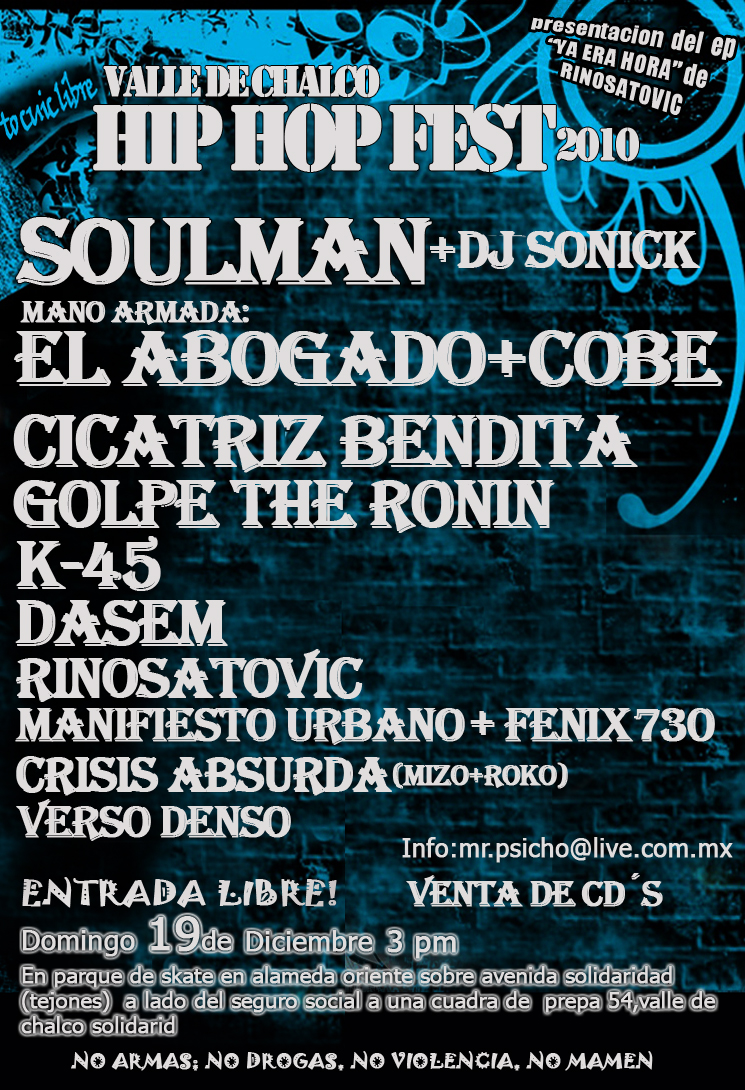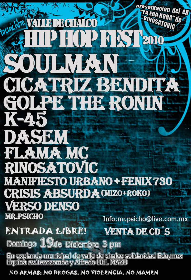 Valle de Chalco | 19 diciembre 2010 December 19, 2010 1 min read by MazPlata Archivo de Eventos Previous Encuentro formación de hip hop – 2010 Next Hip hop fest Zitacuaro 2010