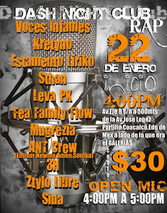 Dash night club rap | 22 enero 2011 January 22, 2011 1 min read by MazPlata Archivo de Eventos Previous Hip hop a dos de tres caidas | 22 Enero 2011 Next Hip-hop | 22 enero 2011